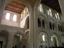 Huit travées en plein cintre furent construites entre 1035 et 1087, mais les cinq premières furent démolies au début du XIXe siècle[20],[note 2]. L'abbatiale (1080-1110) reprend le plan bénédictin adopté à Bernay avec la nef à trois élévations : arcades, tribunes et fenêtres hautes[21]. Le premier niveau comporte de grandes arcades à double rouleau et tore retombant sur des piles cruciformes, le deuxième niveau possède des tribunes, précédées d'une petite coursive d'à peine trente centimètres de large, ouvrant sur la nef par des baies géminées, et le troisième niveau des fenêtres hautes avec une galerie de circulation dans l'épaisseur du mur[22]. Les collatéraux nord et sud sont voûtés d'arêtes. Quatre arcs diaphragmes encadrent la croisée du transept. Initialement en plein cintre, ils furent modifiés, au XVe siècle, en ogives pour renforcer la structure et soutenir la tour-lanterne. Le bras nord du transept date du XVIIIe siècle, reconstruit à la suite d'un effondrement. Le bras sud, lui, est d'origine[3]. Les croisillons du transept sont surmontés de tribunes[23]. Deux baies géminées inscrites dans une grande arcade s'ouvrent largement sur les tribunes[23]. À l'étage supérieur, la galerie de circulation est évidée par un triplet de grandes arcades[23]