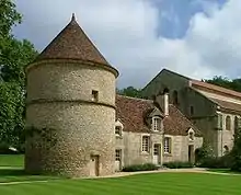 À gauche du palais abbatial, le colombier borde le chemin qui mène à l'église. Les murs de sa tour ont plus d'un mètre d'épaisseur et sa construction doit remonter au XIIe ou XIIIe siècle. De l'autre côté du chemin, deux sculptures de chiens rappellent l'emplacement de l'ancien chenil. Les chiens des ducs de Bourgogne qui chassaient dans la forêt y étaient en pension.