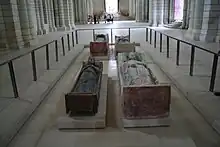 Non loin de la croisée du transept de l’abbatiale ont été installés quatre gisants subsistants de l’ancien cimetière des rois[19]. À l’origine les sépultures des Plantagenets « Henri II, Richard, Aliénor, Jeanne d’Angleterre, toutes quatre, à côté l’une de l’autre et à la suite, couchées et étendues sur tombeaux vides et élevés ».