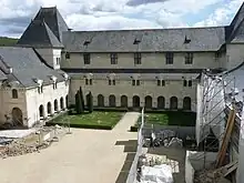 Renée de Bourbon est élue abbesse en 1491, à la mort d'Anne d'Orléans. Elle est la première des cinq abbesses issues de la famille royale de Bourbon à être élue à Fontevraud. Aussitôt élue, elle fait appliquer la réforme et entreprend une rénovation architecturale. Sous son abbatiat, sont construites la clôture de l'abbaye longue d'un kilomètre trois cents et une galerie accolée au transept nord de l'abbatiale[34]. Elle réaménage la partie sud du cloître en y construisant à l'étage quarante-sept cellules (en) pour les moniales, et fait reconstruire le réfectoire[35]. Louise de Bourbon[36] lui succède et poursuit la rénovation du Grand-Moûtier en reconstruisant les trois autres galeries du cloître et en aménageant l'aile est. Elle fait reconstruire dans cette dernière la salle de la communauté et la salle capitulaire où le peintre angevin Thomas Pot réalise les peintures de la Passion du Christ. En 1558, une inondation détruit la plupart des bâtiments de l'infirmerie Saint-Benoît, tout en épargnant la chapelle[37]. Louise de Bourbon meurt en 1575, après avoir été abbesse pendant 41 ans[38]. C'est Éléonore de Bourbon qui lui succède, poursuivant elle aussi les travaux. Elle termine le grand dortoir et décide de reconstruire l'infirmerie de Saint-Benoît, dévastée par les inondations de 1558 : les travaux, considérables, coûtent 37 410 livres[39].