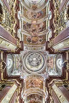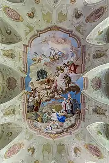 Les fresques des voûtes de la nef et des bas-côtés sont l'œuvre du maître salzbourgeois Johann Michael Rottmayr. La travée centrale est consacrée à Saint Benoît, entouré d'allégories représentant la lutte contre le mal. Sur l'arc avant le dernier panneau, on distingue une colombe, l'âme de Sainte Scolastique qui précède dans le ciel celle de son frère Saint Benoît. Dans la dernière travée, le saint dans la gloire de Dieu : il a retrouvé sa jeunesse, ainsi qu'aimait à se le représenter l'imagination populaire, et il entre dans la joie du Seigneur.