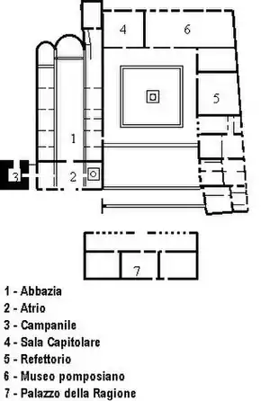La salle capitulaire est ornée de fresques du début du XIVe siècle par un élève de Giotto représentant saint Benoît et des prophètes (mur nord), San Guido et des couples de prophètes (mur sud), la Crucifixion (mur est) ; le cycle de fresques du mur du fond du réfectoire est le plus précieux cycle de fresques de l'abbaye, attribué à un maître de Rimini, peut-être le Maître de Tolentino. Au centre, figure Déisis (Christ entre la Vierge, saint Jean, saint Benoît, saint Guido), à gauche la Dernière Cène, à droite le miracle de saint Guido.