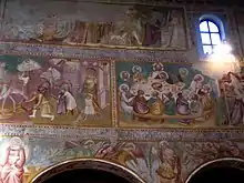 Parmi les images relatives à l'Ancien Testament, figurent : Adam, Eve et le péché originel, Caïn et Abel, l'arche de Noé et le déluge, des épisodes de la vie d'Abraham, Jacob et son rêve, Joseph et ses frères, l'Arche d'alliance, David et Goliath, le prophète Daniel dans la fosse aux lions, le prophète Élie enlevé au ciel par un char de feu. Le Nouveau Testament s'ouvre sur la fresque de l'Annonciation avec un tissu urbain en arrière fond, suivi de la Nativité, de l'Adoration des Mages, du Massacre des Innocents, de la présentation de Jésus au Temple, du Baptême du Christ, de la Noces de Cana. Les deux panneaux qui ferment la bande médiane du mur sud de la nef centrale illustrent les passages évangéliques relatifs à la fille de Jaïre et au fils de la veuve de Naïm, tous deux ressuscités par Jésus. La première scène évangélique représentée sur la partie nord de l'abbaye est la résurrection de Lazare de Béthanie, suivie par l'entrée du Christ à Jérusalem, la Dernière Cène, le Jardin des Oliviers (Jésus s'écartant des disciples, l'acceptation du sacrifice, le baiser de Judas). La Crucifixion représente un Christ composite, pâle et sans couronne d'épines, rappelant les fresques de Giotto dans la chapelle Scrovegni et de Giusto de Menabuoi dans le baptistère de Padoue ; les bras tendus à l'agonie et les os des côtes évoquent le thème du crucifixus dolorosus, un mélange de souffrances physiques et intérieures clairement présentes dans les crucifix en bois polychrome du XIVe – XVe siècle[8]; suivi par la Déposition du Christ, l'incrédulité de Thomas, l'Ascension, la Pentecôte.
