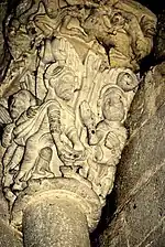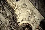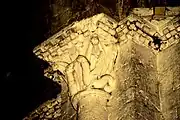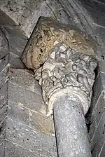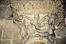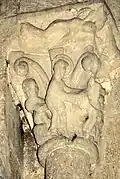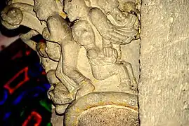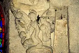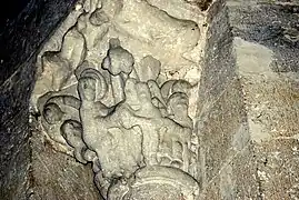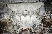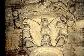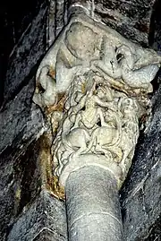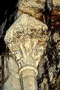 Le chapiteau est très abîmé, mais mérite attention en raison de la qualité des reliefs qui ont survécu au vandalisme.