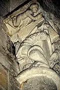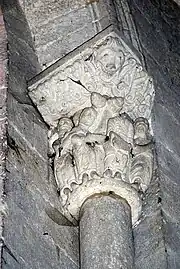Des six chapiteaux de la nef, le seul figuré est le troisième sur le mur nord. Le chapiteau en face, sur le mur sud a un décor végétal. Les quatre autres chapiteaux sont sans décor.