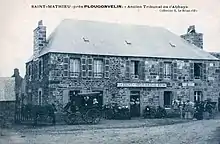 « Saint-Mathieu de Fine-Terre est aujourd'hui dans la paroisse de Plougonvelen [ Plougonvelin ]. Cette ancienne paroisse était dédiée à saint Mathieu, apôtre et évangéliste, dit en breton saint Mazhé ou Mahé ; elle a tiré son nom français du breton Loc Mahé Pen-ar-Bed, dont il est la traduction littérale. Ce nom, latinisé dans le Moyen-Âge en de Fine-Postremo, a été altéré souvent et transformé en celui de "Saint-Mathieu-de-Fine-Posterne". (...)[17]. »