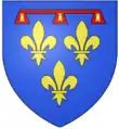 Les armoiries de l'abbaye de Saint-Pierre-sur-Dives : D'azur à trois fleurs de lys, 2 et 1, et un lambel de trois pendants, de gueules, en chef, chaque pendant chargé d'une tour d'or[17].