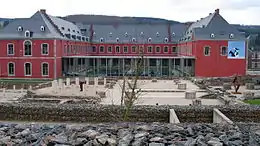 Le porche d'entrée de l'abbaye, daté 1522 et 1677, porte l'écu des Manderscheidt[1]. Dans la cour d'honneur, on aperçoit, du côté nord, les dépendances datant de 1714 ; à droite, le local du conseil de la principauté (1717) qui contient le musée ; en face, une construction à fronton armorié (1780-1786), l'hôtel de ville[1].