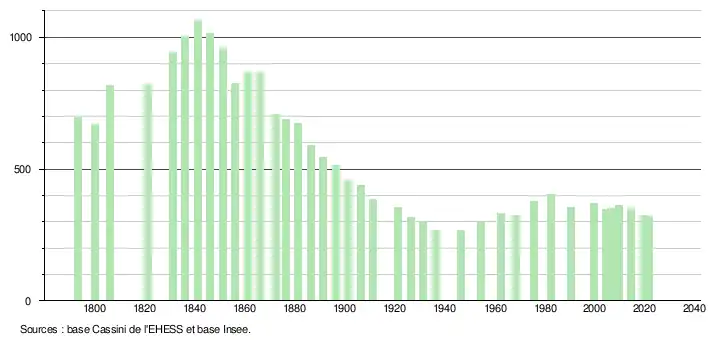 L'évolution du nombre d'habitants est connue à travers les recensements de la population effectués dans la commune depuis 1793. Pour les communes de moins de 10 000 habitants, une enquête de recensement portant sur toute la population est réalisée tous les cinq ans, les populations légales des années intermédiaires étant quant à elles estimées par interpolation ou extrapolation[23]. Pour la commune, le premier recensement exhaustif entrant dans le cadre du nouveau dispositif a été réalisé en 2004[24].