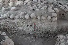 Une, et peut-être deux strates, datées du bronze moyen IIB, ont été exposées sous une phase érodée de l'âge du bronze tardif sous la couche arable.