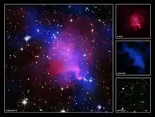 Vue composite d'Abell 520 montrant : en bleu, la distribution de la matière noire déterminée par le télescope spatial Hubble ; en orange, la distribution des galaxies vues par le télescope CFH ; en vert, le milieu intra-amas chauffé par la collision vu par le télescope spatial Chandra[1]. | |
