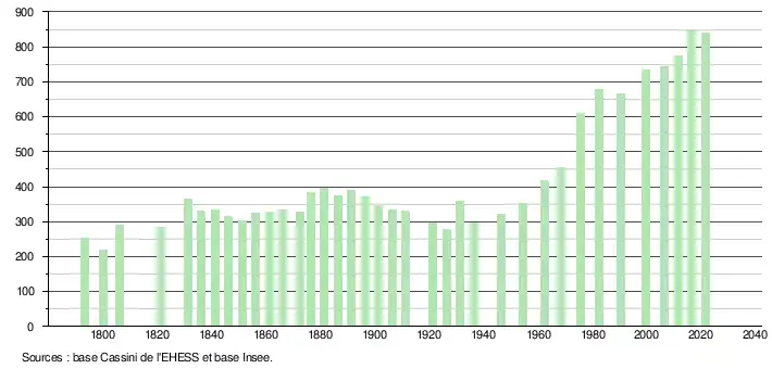 L'évolution du nombre d'habitants est connue à travers les recensements de la population effectués dans la commune depuis 1793. Pour les communes de moins de 10 000 habitants, une enquête de recensement portant sur toute la population est réalisée tous les cinq ans, les populations légales des années intermédiaires étant quant à elles estimées par interpolation ou extrapolation[25]. Pour la commune, le premier recensement exhaustif entrant dans le cadre du nouveau dispositif a été réalisé en 2006[26].