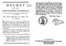 La Société anglaise pour l'abolition[20] obtient une enquête de la Couronne britannique[21] dès 1788, quand l’œuvre de l'ex-esclave Cugoano est traduite en français et qu'un autre, Olaudah Equiano, épouse une Anglaise. Une campagne « anti-saccharistes » réclame le boycott du sucre en 1791[19], année où explose la révolution haïtienne, qui terrorise les planteurs réunis au Club de l'hôtel Massiac. La production du sucre s'effondre et malgré « l'augmentation fulgurante » de son prix[22], la Révolution française abolit quand même l'esclavage au niveau national par le décret d'abolition de l'esclavage du 4 février 1794 (16 pluviôse an II), après avoir été précédemment aboli localement sur l’île de Saint-Domingue par le décret du 29 août 1793. Le parlement reçoit par la poste 653 déclarations de félicitations[1], la plupart émanant de communes et sociétés populaires[1], et tous les départements sauf 3 (Corrèze, Alpes-Maritimes et Léman)[1].