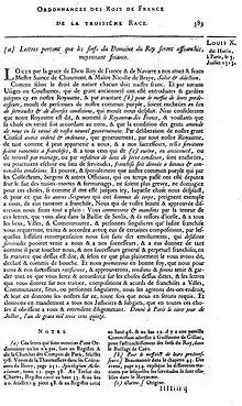 Dans le royaume de France, l'édit du 3 juillet 1315 de Louis X le Hutin, proclama que le sol de France affranchissait quiconque y posait le pied[30]. On trouve des traces tardives et ponctuelles de l’application de ce texte par les parlements français au XVIe siècle : à Bordeaux, en 1571, il est invoqué pour justifier la libération d’une cargaison d’esclaves africains, transportée par un négrier normand[31]. L'application de l'ordonnance royale demeura cependant strictement circonscrite au territoire européen, ne remettant à aucun moment en cause la participation active de Français au commerce triangulaire et à la mise en place d'une économie esclavagiste dans ses colonies antillaises. Avec le développement de la traite, la législation évolua sur le sol de la métropole dans un sens de plus en plus défavorable aux esclaves : l'automaticité de l'affranchissement fit place à la tolérance de l'esclavage (édit d’)[32] puis au strict contrôle du séjour des Noirs (déclaration royale de 1738)[33],[34],[N 1].