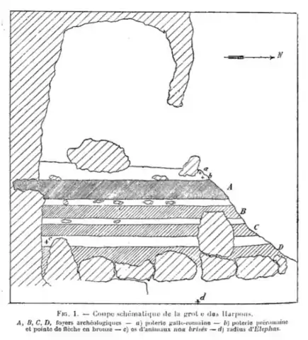 En 1913 et 1914, Saint-Périer y reconnaît trois niveaux de remplissage magdalénien et un niveau de Solutréen supérieur[13],[1]. Il note minutieusement les localisations des éléments des couches, ce qui permet de nos jours de replacer de nombreux éléments malgré leur dispersion[14]. Selon Méroc (1959), la grotte a donné du Solutréen, du Magdalénien et de l'Azilien[11], ce dernier aussi mentionné par Lalande qui cite également, en surface, un dépôt de l'âge du bronze[9]. Mais pour San Juan (2003), la stratigraphie commence au Solutréen et se termine au Magdalénien[15], incluant tous les niveaux du Magdalénien de l'Azilien au Magdalénien ancien[16] ; le seul site comparable pour une telle série stratigraphique est la grotte de Troubat dans les Hautes-Pyrénées[17].