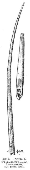 Le niveau B (Magdalénien III ou IV)[40] et le niveau azilien[41] de l'abri des Harpons ont livré des aiguilles à chas[42].