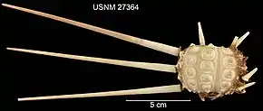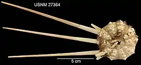 Ce sont des oursins réguliers à la coquille (appelée « test ») sphérique légèrement allongée verticalement. L'anus est situé au sommet (à l'apex, au centre du système apical), et la bouche en dessous, face au substrat. Les radioles primaires (piquants) sont clairsemées mais très robustes. Le test est petit (2,5 cm) comparativement aux radioles primaires très longues, effilées et facettées (rhomboïdales), qui peuvent donner un diamètre total approchant les 20 cm[1]. Elles commencent par un col large et long (2-3 cm), ornementé de rangées de nœuds ; elles apparaissent superficiellement lisses. Nettoyées, elles sont blanches sur leur première moitié et colorées de vert ou de bleu vers la pointe. Les radioles orales sont incurvées et ont les bords dentelés ; les radioles secondaires sont jaune-brun, en forme de petites aiguilles de sapin légèrement aplaties[2].