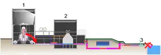 Sur demande du gouvernement, TEPCO doit alors tout faire pour éviter de nouveaux rejets dans l'océan et donc décontaminer l'eau sur place. Une première usine de traitement, codéveloppée par Areva et Veolia[74], est installée près du réacteur no 4, puis une deuxième en juin pour traiter les 15 000 mètres cubes d'eau contaminée en provenance de l'unité 2 et les 45 000 mètres cubes d'eau moins contaminée en provenance des salles des machines des réacteurs 1 et 3[F 3].