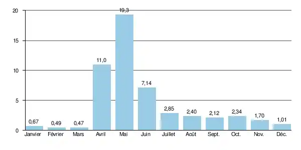 Le débit moyen mensuel observé en mars (minimum d'étiage) est de 0,47 m3/s, soit plus ou moins 2,5 % du débit moyen du mois de mai (19,3 m3/s), ce qui montre des variations saisonnières d'amplitude très élevées. Et ces écarts de débit mensuel peuvent être encore plus marqués d'après les années.
