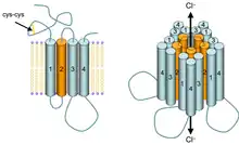 Les récepteurs ionotropes GABAA sont formés de 5 sous-unités glycoprotéiques, entourant un pore laissant entrer le chlore lorsque le GABA se fixe sur leur site de liaison. L'entrée de ces anions Cl− hyperpolarise le neurone postsynaptique et l'inhibe[2], en rendant le passage d'une vague de potentiel d'action plus difficile :
