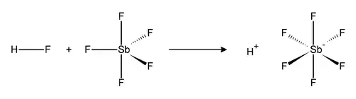La réaction du fluorure d'hydrogène HF et du pentafluorure d'antimoine SbF5 est exothermique. HF libère l'ion H+ et sa base conjuguée F− est séquestrée par un ou plusieurs SbF5 pour conduire à l'ion octaédrique [SbF6]−. Cet anion est non coordinant dans la mesure où il est à la fois très faiblement nucléophile et très faiblement basique.