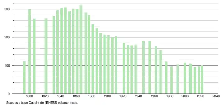L'évolution du nombre d'habitants est connue à travers les recensements de la population effectués dans la commune depuis 1793. Pour les communes de moins de 10 000 habitants, une enquête de recensement portant sur toute la population est réalisée tous les cinq ans, les populations légales des années intermédiaires étant quant à elles estimées par interpolation ou extrapolation[20]. Pour la commune, le premier recensement exhaustif entrant dans le cadre du nouveau dispositif a été réalisé en 2007[21].
