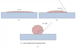 L'angle de contact θ est fonction de l'adhésion de la dispersion (l'interaction entre les molécules adhésives et les molécules solides) et de la cohésion de l'adhésif liquide. Si l'adhésion à la surface du substrat est forte et l'adhésion dans le liquide est faible, le degré de mouillage est élevé[5]. Inversement, la combinaison d'une faible adhésion et d'une cohésion élevée conduit à une vitesse d'angle de contact plus élevée et à une mauvaise mouillabilité de la surface du substrat, qui se produit lorsque des gouttelettes se forment sur la surface plutôt qu’une couche de liquide. Un angle de contact plus petit indique une plus grande adhésion, car il y a une plus grande zone de contact entre l'adhésif et le substrat, ce qui se traduit par une énergie de surface totale du substrat plus grande et une force d'interaction plus élevée dans le liquide et le substrat.