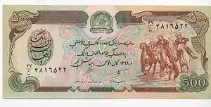 .jpg.webp) Billet de vingt afghanis pendant la monarchie, avers (1963). Billet de vingt afghanis pendant la monarchie, avers (1963).