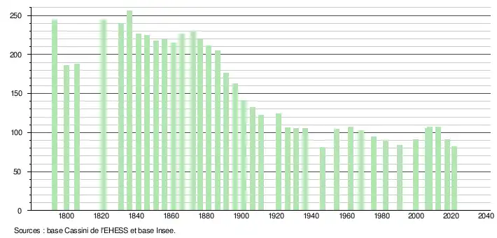 L'évolution du nombre d'habitants est connue à travers les recensements de la population effectués dans la commune depuis 1793. Pour les communes de moins de 10 000 habitants, une enquête de recensement portant sur toute la population est réalisée tous les cinq ans, les populations légales des années intermédiaires étant quant à elles estimées par interpolation ou extrapolation[21]. Pour la commune, le premier recensement exhaustif entrant dans le cadre du nouveau dispositif a été réalisé en 2007[22].