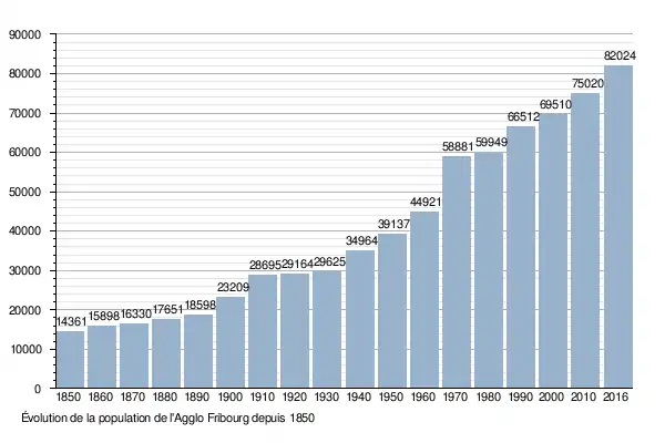 L'Agglomération de Fribourg avait 82 024 habitants en 2016[5]. Le graphique résume l'évolution de la population (Avry, Belfaux, Corminboeuf, Guin, Fribourg, Givisiez, Granges-Paccot, Marly, Matran et Villars-sur-Glâne) entre 1850 et 2016 :