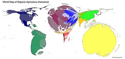 Depuis 1990, le marché des aliments et autres produits biologiques a augmenté rapidement, atteignant 63 milliards de dollars dans le monde en 2012[4]. Cette demande s'est accompagnée d'une augmentation de la surface des terres agricoles destinées à l'agriculture biologique, qui s'est accrue de 8,9 % par an en moyenne entre 2001 et 2011[5]. Dans le monde, plus de 37,2 millions d'hectares étaient consacrés à l'agriculture biologique à la fin de l'année 2011[6], soit 0,9 % des terres agricoles des 162 pays pris en compte dans le calcul. En 2015, l'agriculture biologique occupait 6,2 % de la superficie agricole utilisée de l'Union européenne[7].