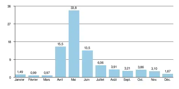 Le débit moyen mensuel observé en mars (minimum d'étiage) est de 0,97 m3/s, soit moins de 3 % du débit moyen du mois de mai (33,8 m3/s), ce qui souligne des variations saisonnières d'amplitude très élevées. Ces écarts de débit mensuel peuvent être encore plus marqués d'après les années : sur la durée d'observation de 34 ans, le débit mensuel minimal a été de 0,40 m3/s en , tandis que le débit mensuel maximal s'élevait à 130 m3/s en . Mais ce débit très élevé était assez exceptionnel.