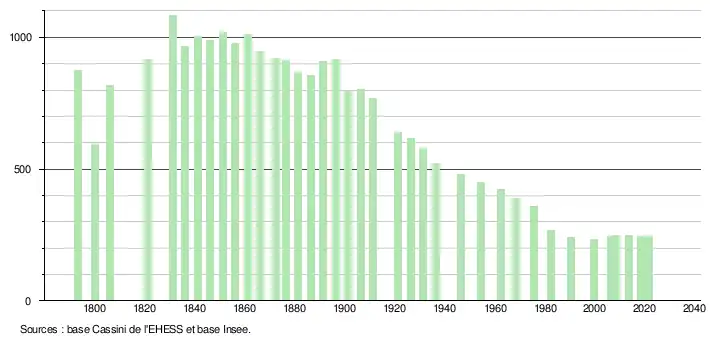 L'évolution du nombre d'habitants est connue à travers les recensements de la population effectués dans la commune depuis 1793. Pour les communes de moins de 10 000 habitants, une enquête de recensement portant sur toute la population est réalisée tous les cinq ans, les populations légales des années intermédiaires étant quant à elles estimées par interpolation ou extrapolation[18]. Pour la commune, le premier recensement exhaustif entrant dans le cadre du nouveau dispositif a été réalisé en 2008[19].