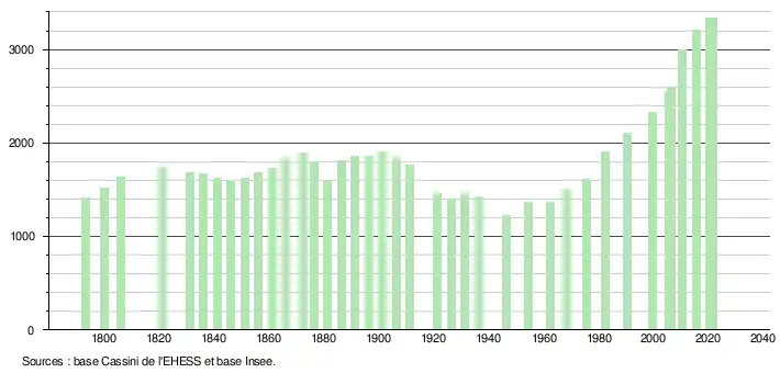 L'évolution du nombre d'habitants est connue à travers les recensements de la population effectués dans la commune depuis 1793. Pour les communes de moins de 10 000 habitants, une enquête de recensement portant sur toute la population est réalisée tous les cinq ans, les populations légales des années intermédiaires étant quant à elles estimées par interpolation ou extrapolation[38]. Pour la commune, le premier recensement exhaustif entrant dans le cadre du nouveau dispositif a été réalisé en 2005[39].