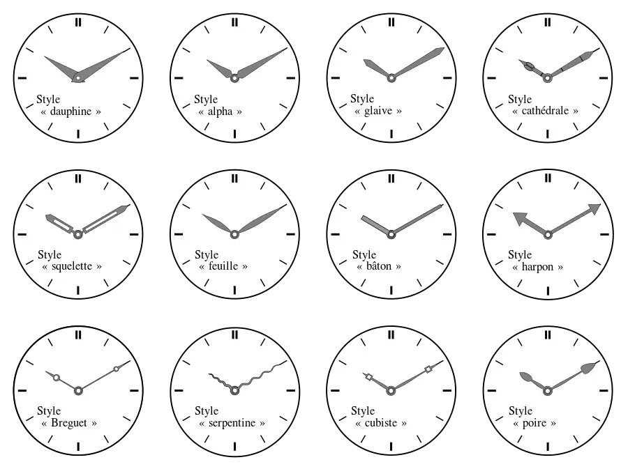 Il existe une immense variété de style dans le dessin des aiguilles d'horlogerie. La figure ci-dessous représente les grandes familles esthétiques les plus connues[3],[4] :
