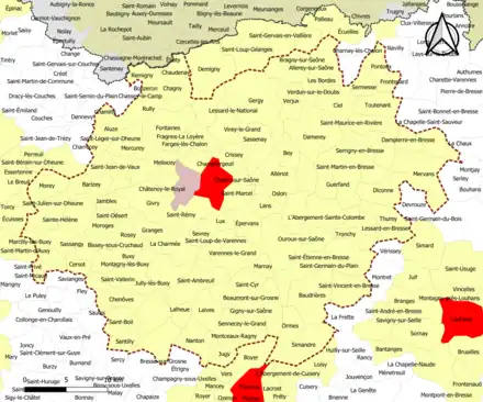 Communes de la couronneSaône-et-Loire107L'Abergement-Sainte-Colombe, Allerey-sur-Saône, Allériot, Aluze, Barizey, Baudrières, Beaumont-sur-Grosne, Bey, Bissey-sous-Cruchaud, Les Bordes, Bragny-sur-Saône, Buxy, Cersot, Chagny, Chamilly, Champforgeuil, La Chapelle-de-Bragny, La Charmée, Charrecey, Châtel-Moron, Châtenoy-en-Bresse, Chaudenay, Chenôves, Ciel, Crissey, Damerey, Dampierre-en-Bresse, Diconne, Dracy-le-Fort, Épervans, Farges-lès-Chalon, Fontaines, Fragnes-La Loyère, Gergy, Gigny-sur-Saône, Givry, Granges, Guerfand, Jambles, Jugy, Jully-lès-Buxy, Laives, Lalheue, Lans, Lessard-en-Bresse, Lessard-le-National, Lux, Marcilly-lès-Buxy, Marnay, Mellecey, Mercurey, Mervans, Messey-sur-Grosne, Montagny-lès-Buxy, Montceaux-Ragny, Montcoy, Morey, Moroges, Nanton, Ormes, Oslon, Ouroux-sur-Saône, Pontoux, La Racineuse, Remigny, Rosey, Rully, Saint-Ambreuil, Saint-Boil, Saint-Christophe-en-Bresse, Saint-Cyr, Saint-Denis-de-Vaux, Saint-Désert, Saint-Didier-en-Bresse, Saint-Étienne-en-Bresse, Saint-Germain-du-Plain, Saint-Germain-lès-Buxy, Sainte-Hélène, Saint-Jean-de-Vaux, Saint-Loup-de-Varennes, Saint-Marcel, Saint-Mard-de-Vaux, Saint-Martin-en-Bresse, Saint-Martin-sous-Montaigu, Saint-Maurice-en-Rivière, Saint-Privé, Saint-Rémy, Saint-Vallerin, Saint-Vincent-en-Bresse, Santilly, Sassangy, Sassenay, Saules, Sennecey-le-Grand, Sermesse, Serrigny-en-Bresse, Sevrey, Simandre, Thurey, Toutenant, Tronchy, Varennes-le-Grand, Verdun-sur-le-Doubs, Verjux, Villegaudin, Villeneuve-en-Montagne, Virey-le-Grand.
