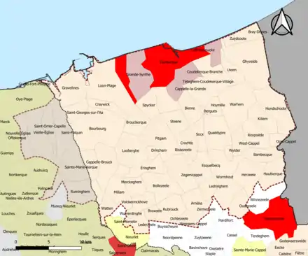 | Communes de la couronne | Nord | 54 | Armbouts-Cappel, Arnèke, Bambecque, Bergues, Bierne, Bissezeele, Bollezeele, Bourbourg, Bray-Dunes, Brouckerque, Broxeele, Cappelle-Brouck, Craywick, Crochte, Drincham, Eringhem, Esquelbecq, Ghyvelde, Grand-Fort-Philippe, Gravelines, Herzeele, Holque, Hondschoote, Houtkerque, Hoymille, Killem, Lederzeele, Ledringhem, Looberghe, Loon-Plage, Merckeghem, Millam, Ochtezeele, Oost-Cappel, Oudezeele, Pitgam, Quaëdypre, Rexpoëde, Rubrouck, Saint-Georges-sur-l'Aa, Saint-Pierre-Brouck, Socx, Spycker, Steene, Téteghem-Coudekerque-Village, Uxem, Volckerinckhove, Warhem, Watten, West-Cappel, Wormhout, Wylder, Zegerscappel, Zuydcoote. |