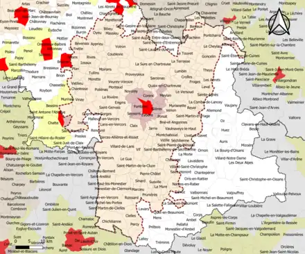 Localisation de l'aire d'attraction de Grenoble dans le département de l'Isère.  | |