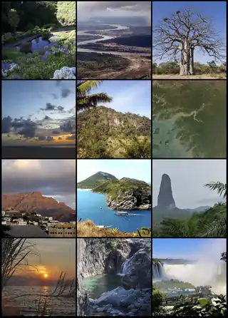 Aires protégées dans plusieurs pays lusophones. De gauche à droite, et de haut en bas : , parc naturel de Ribeira dos Caldeirões (pt) aux Açores ; parc national du Limpopo ; aire de protection de l'environnement de l'île de Maiandeua ; parc national Nino Konis Santana ; vue aérienne de la Guinée-Bissau ; parc naturel de Monte Verde (Cap-Vert) ; réserve marine Arraial do Cabo ; Parc naturel Obô de São Tomé ; réserve nationale de Niassa au Mozambique ; parc national de Peneda-Gerês au Portugal et enfin le parc national de l'Iguaçu au Brésil.