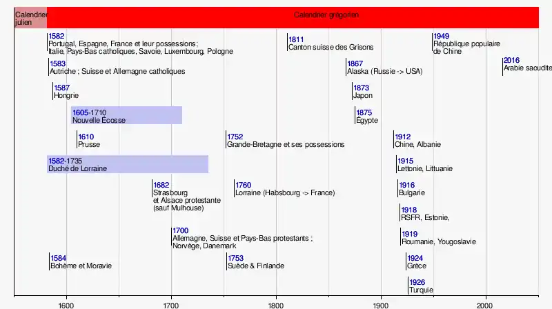 Le passage du calendrier julien au calendrier grégorien, promulgué par le pape Grégoire XIII en février 1582, a eu lieu dans un court délai, souvent moins d'un an, dans la plupart des pays catholiques ; en revanche, les pays protestants comme les pays orthodoxes ont ignoré ou refusé cette réforme, du fait qu'ils récusaient l'autorité religieuse du pape, a fortiori, les pays non chrétiens, musulmans ou autres (Chine, etc.).