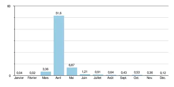 Les hautes eaux se déroulent au printemps, de fin mars à début mai, ce qui correspond à la fonte des neiges. Au mois de mai, le débit plonge et s'effondre presque totalement en juin, ce qui constitue le début de la période des basses eaux. Celle-ci a lieu de juin à février-mars inclus, avec un long plancher de décembre à février, lié au gel de l'hiver.