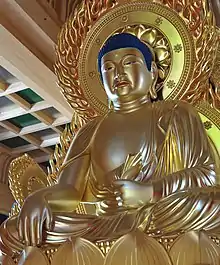 Il est représenté faisant de la main droite la mudra bhūmisparsha (toucher de la terre), marquant sa détermination inébranlable de se diriger vers l’illumination, et tenant un vajra dans la main gauche.