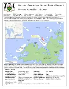 En plus de Toronto, Heisey contribue à la vie publique du canton de Georgian Bay. En juillet 2007, dans le but de lui rendre hommage, le ministère de Ressource naturelles nomme un groupe d'îles, situées près de l'île Beausoleil et de Honey Harbour dans la baie géorgienne, à son nom[39].