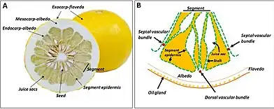 Enfin, l'albedo est riche en fibres dont, chez l'orange, le polydextrose au potentiel prébiotique élevé, il stimule la croissance et le métabolisme de L. acidophilus et B. animalis[12].