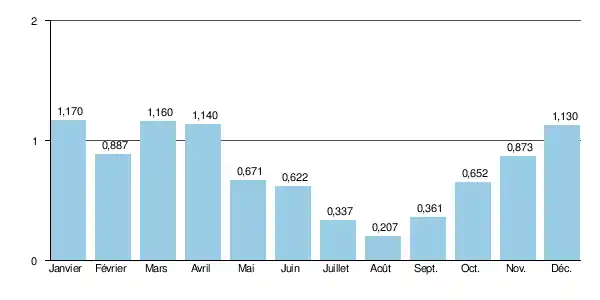 Par contre le débit moyen mensuel inter-annuel (avril) est de 1,21 m3/s[3] et son régime hydrologique est dit régime pluvial[3].