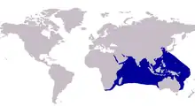 Distribution de Alectis indica, toutefois cette espèce est essentiellement présente le long des côtes