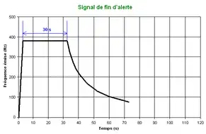 Le signal national de fin d'alerte comporte un cycle unique consistant en une seule période de fonctionnement au régime nominal (380 Hz +/- 10 Hz) d'une durée de 30 secondes.