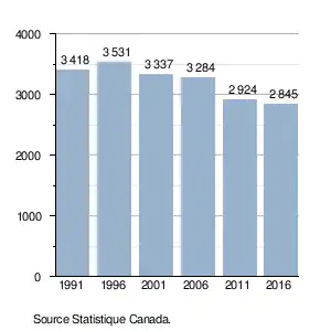 - La définition géographique du centre de population a changé entre 2011 et 2016. La population du centre de population de 2011 était de 3 209 habitants selon la définition de 2011 avec un territoire de 4,15 km2 alors que la population la même année (2011) selon le territoire défini en 2016 et couvrant 2,07 km2 était de 2 924 habitants, soit un écart de -8,8 %.
