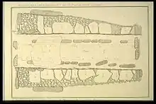 Les deux parois latérales sont constituées d'une dizaine d'orthostates en calcaire d'une hauteur variant entre 0,65 m et 1,80 m. Ces dalles étaient surmontées de couches de pierres sèches afin de compenser le différentiel de niveau entre leur sommet et le plafond. Le dernier tiers de l'allée était recouvert par une table de couverture (2,90 m de longueur, 3 m de large et épaisse de 0,55 m), toujours en place, et au-dessus de l'entrée (1,40 m de longueur) par un type de couverture inconnu car désormais disparu[1].