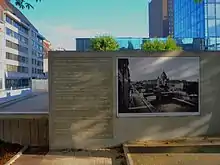 Un mur de béton lisse orné de quatre photos anciennes, retraçant l’histoire du lieu et montrant des vues extérieures et intérieures de l’ancienne synagogue s’élève tout le long de cette allée.